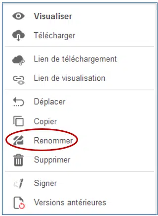 - Cliquer sur le bouton Action à droite du fichier ou du dossier à renommer