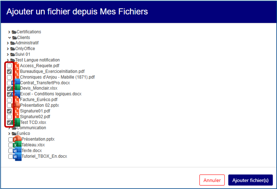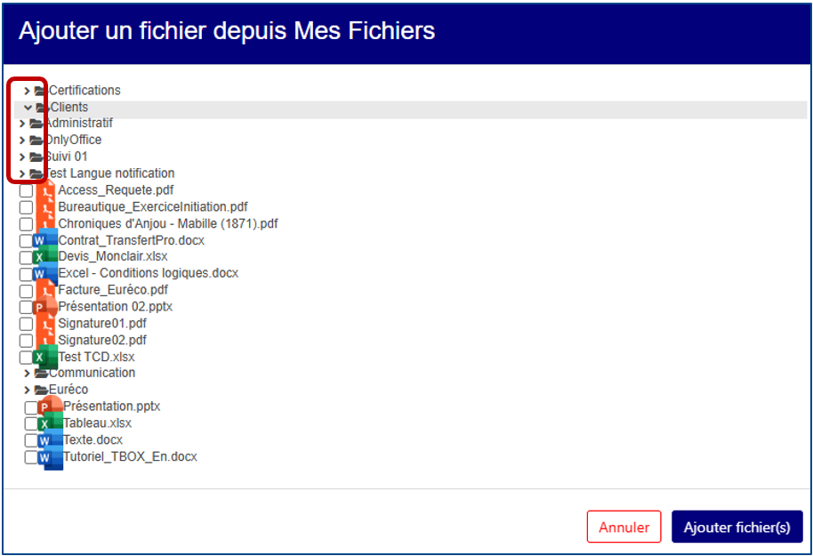 - Les fichiers ajoutés à partir de son poste de travail et de son espace TBox apparaissent à l’écran :
