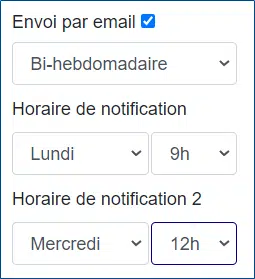 • Bihebdomadaire : choisir les deux jours et heures auxquels l’expéditeur recevra deux fois par semaine ses notifications :