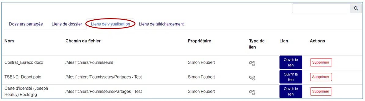 L’onglet Liens de visualisation affiche les fichiers accessibles par un lien de visualisation :