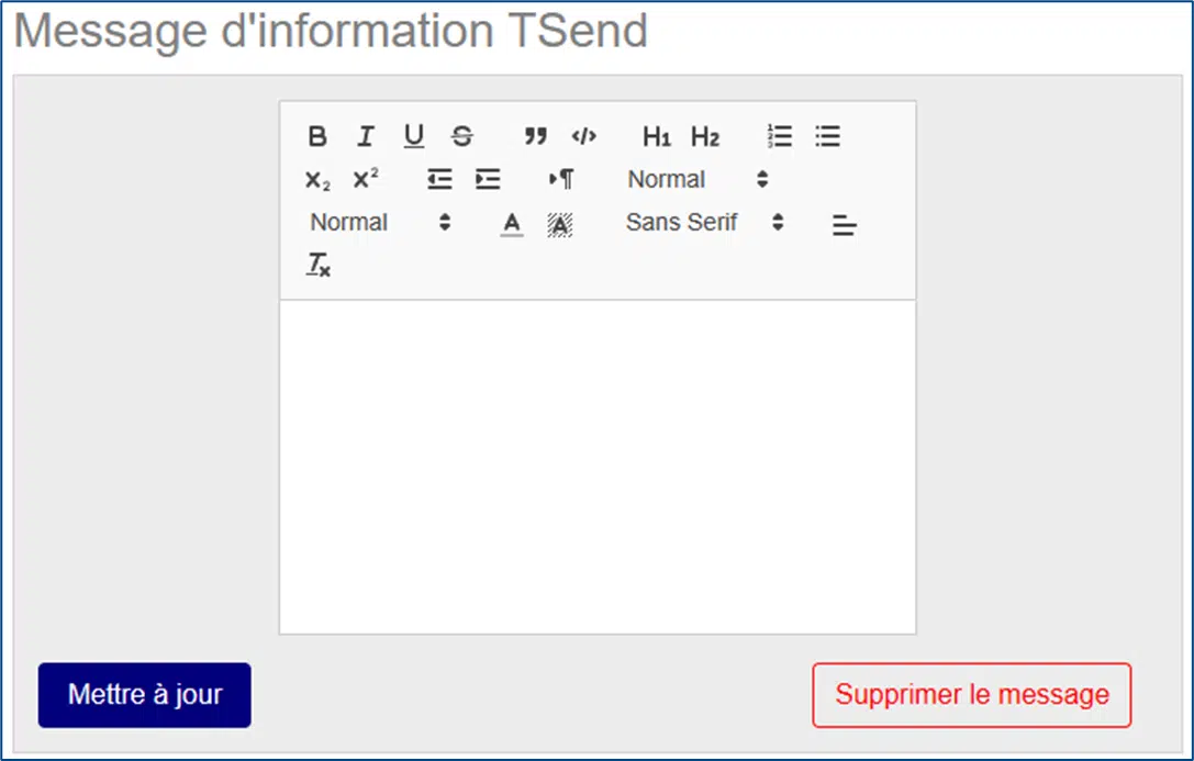 Le message d’information TSend est un texte personnalisé — message d’accueil, explication du fonctionnement de TSend, numéros de téléphone utiles, etc. — qui apparaîtra sur la page d’accueil de TSend et visible par tous les utilisateurs de son compte.