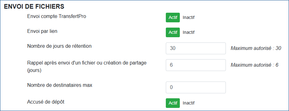 - Nombre de jours de rétention : nombre de jours maximum pendant lesquels un fichier envoyé peut être téléchargé,