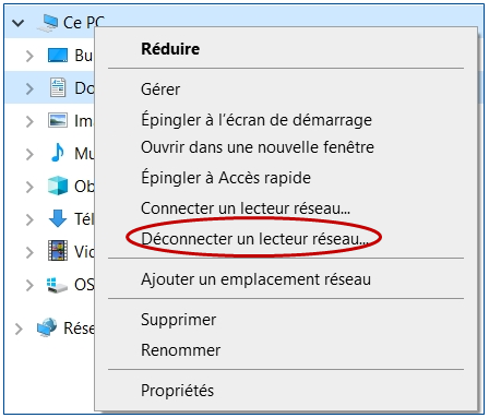- Clic droit sur le poste de travail (en général Ce Pc) et cliquer sur Déconnecter un lecteur réseau :