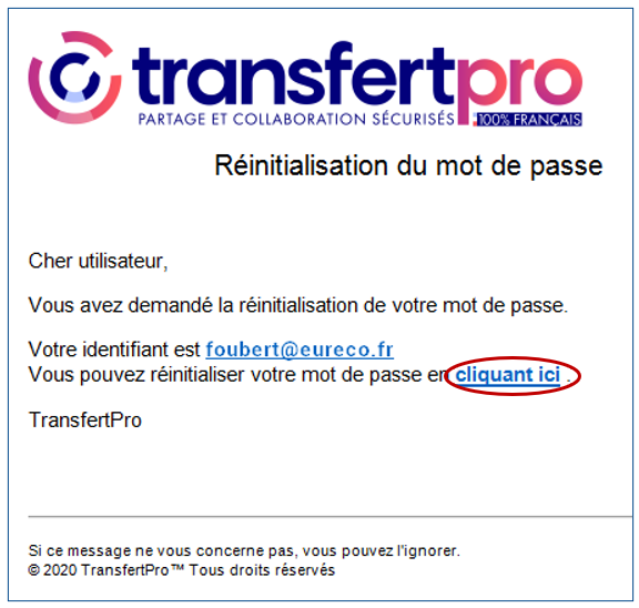 - Un message confirme l’envoi d’un courriel pour le mot de passe oublié :