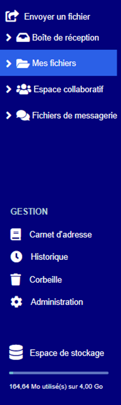 À partir de son interface TBox, l’utilisateur Interne peut envoyer des fichiers sécurisés, recevoir des pièces jointes dans sa boîte de réception, stocker partager des fichiers et des dossiers dans « Mes fichiers », consulter les dossiers partagés avec lui, gérer son profil dans « Administration » et aussi accéder aux autres fonctions de TransfertPro comme TSend, etc.